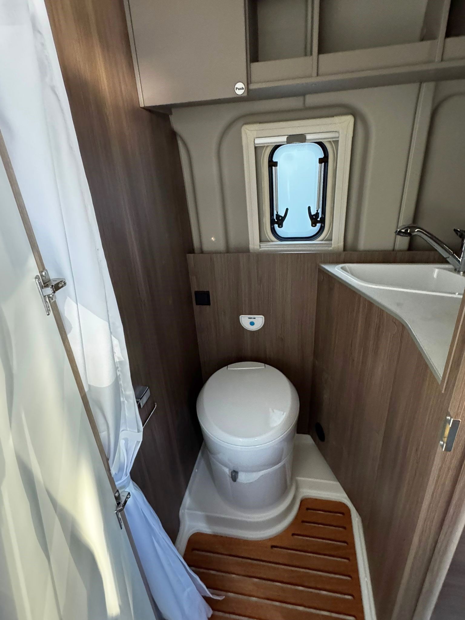 > Bad mit Toilette, Duschausstattung (Brausekopf ausziehbar, Brausehalter), Seitenfenster, Fußbodengitter aus Holz